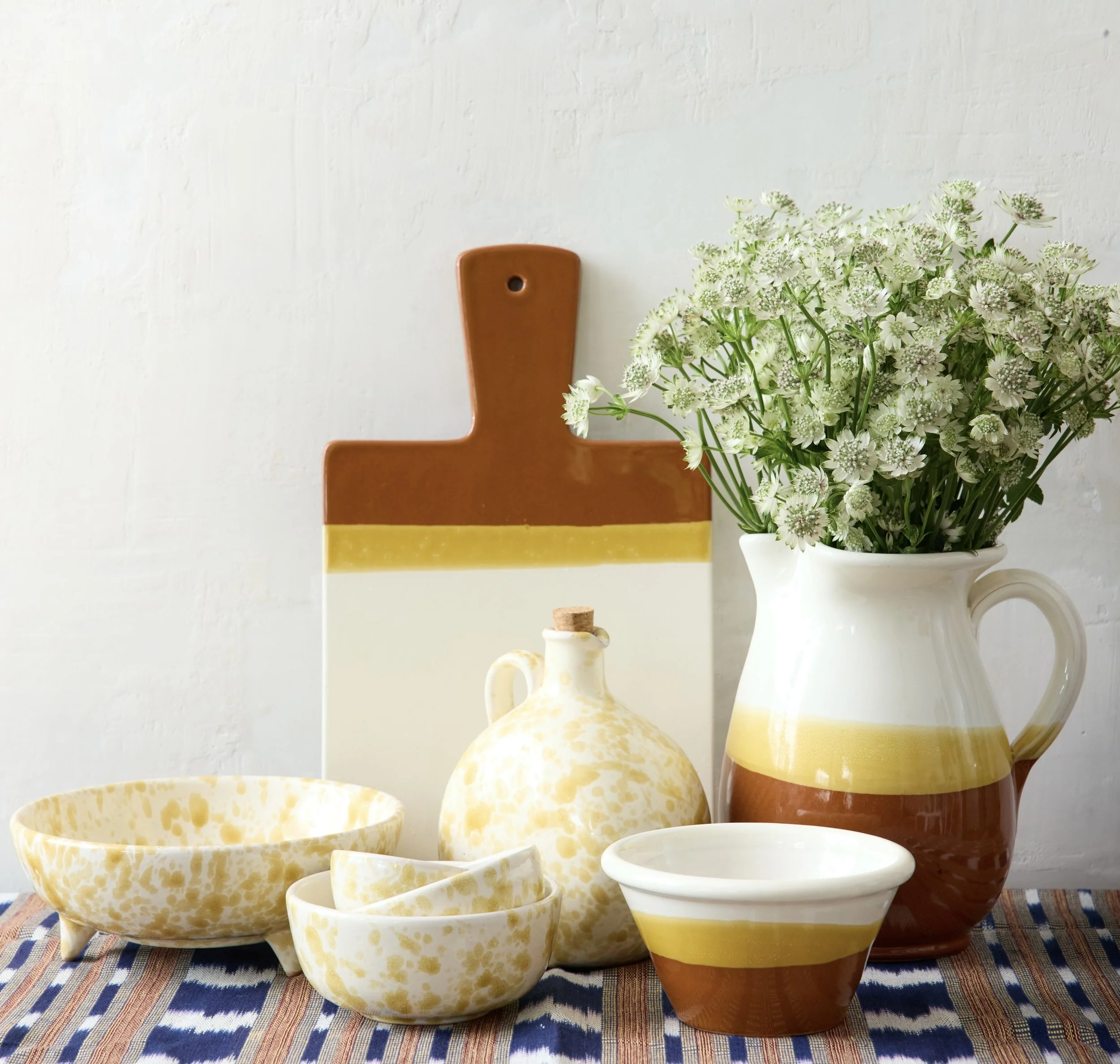 The Terra Collection is inspired by the earth-tone landscapes of Puglia - sunbaked clay, the dry earth of the olive grove, and the warm glow of terracotta sunsets. Each piece is hand-thrown and hand-glazed, with layered bands of natural color that reflect soil, stone and fading light. The ivory and earthen glazes overlap, drip, and blend, creating a soft transition where the color meets and hues collide. Subtle varations in tone and edge are part of the process, no dripping can be exactly re-produced ensuring that every piece carries its own character and no two look exactly alike.